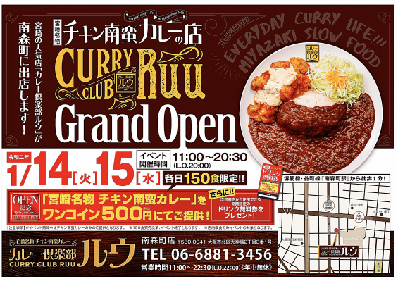 関西エリア6号店目(全国8号店)「カレー倶楽部ルウ寺田町駅前店」を大阪府大阪市生野区にオープン致します。
